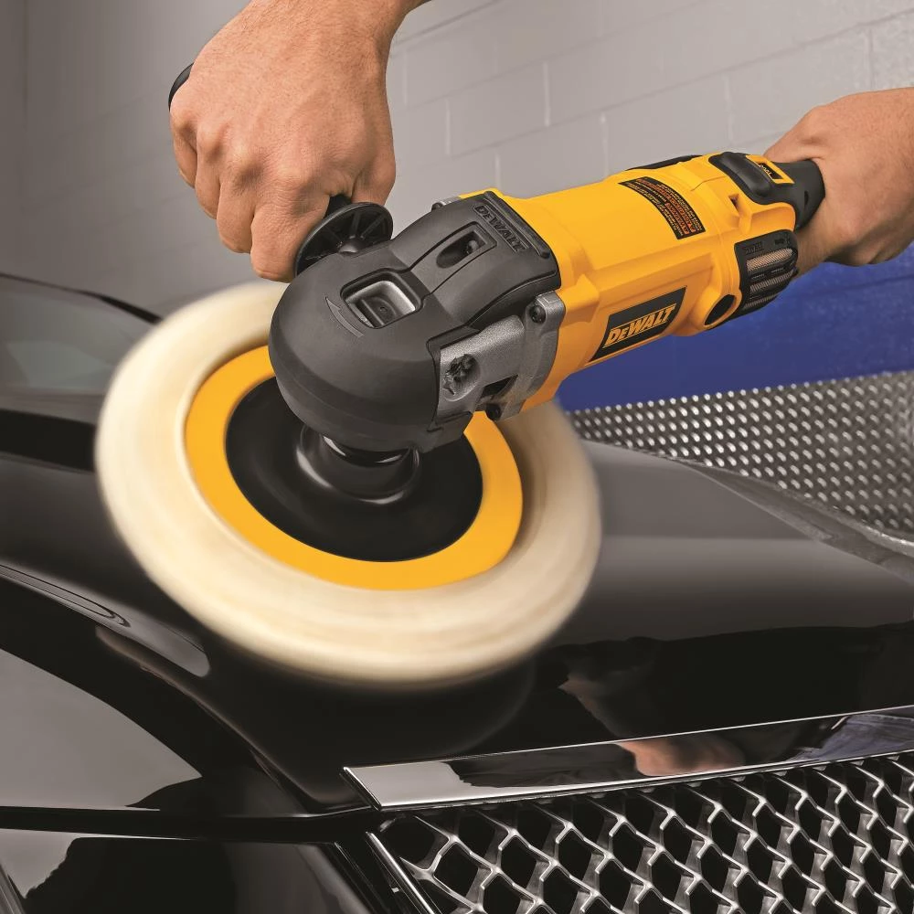 The DEWALT DWP849X 7 In./9 In. variable speed polisher has a powerful, 12.0 Amp, all ball-bearing construction motor for long life and durability. It has electronic control that maintains specified speed under load delivering the desired finish results. The conveniently located variable speed dial lets user set maximum speed from 0-600/3500 rpm for different materials and applications. It also has a variable speed trigger allows user to control speed from 0 to dialed maximum setting easily. It has heat-treated, precision-cut steel gears for smooth operation and external brush caps for easy servicing. The large spindle lock button allows for easy and quick backing plate changes. It also features a wool ingestion shield that eliminates wool ingestion increasing tool life and reducing service costs and a non mar rubber gear case cover that reduces surface imperfections and improves gripping surface. Includes polisher, hook and loop backing pad bale and straight side handles.