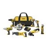 The DEWALT DCK1020D2 combo kit is ideal for almost any cutting, drilling or fastening applications. This kit includes a DCD771 drill/driver, DCF885 impact driver, DCE100B blower, DCL040 flashlight, DCR006 Bluetooth speaker, DCS355 oscillating tool, DCG412 grinder, DCS393 circular saw, DCS381 reciprocating saw and DCV517 wet/dry vacuum. This kit also includes 2 batteries, a charger and (2) contractor bags for portability.