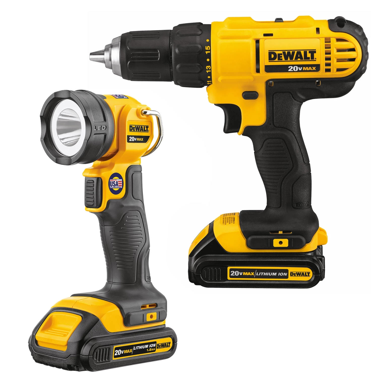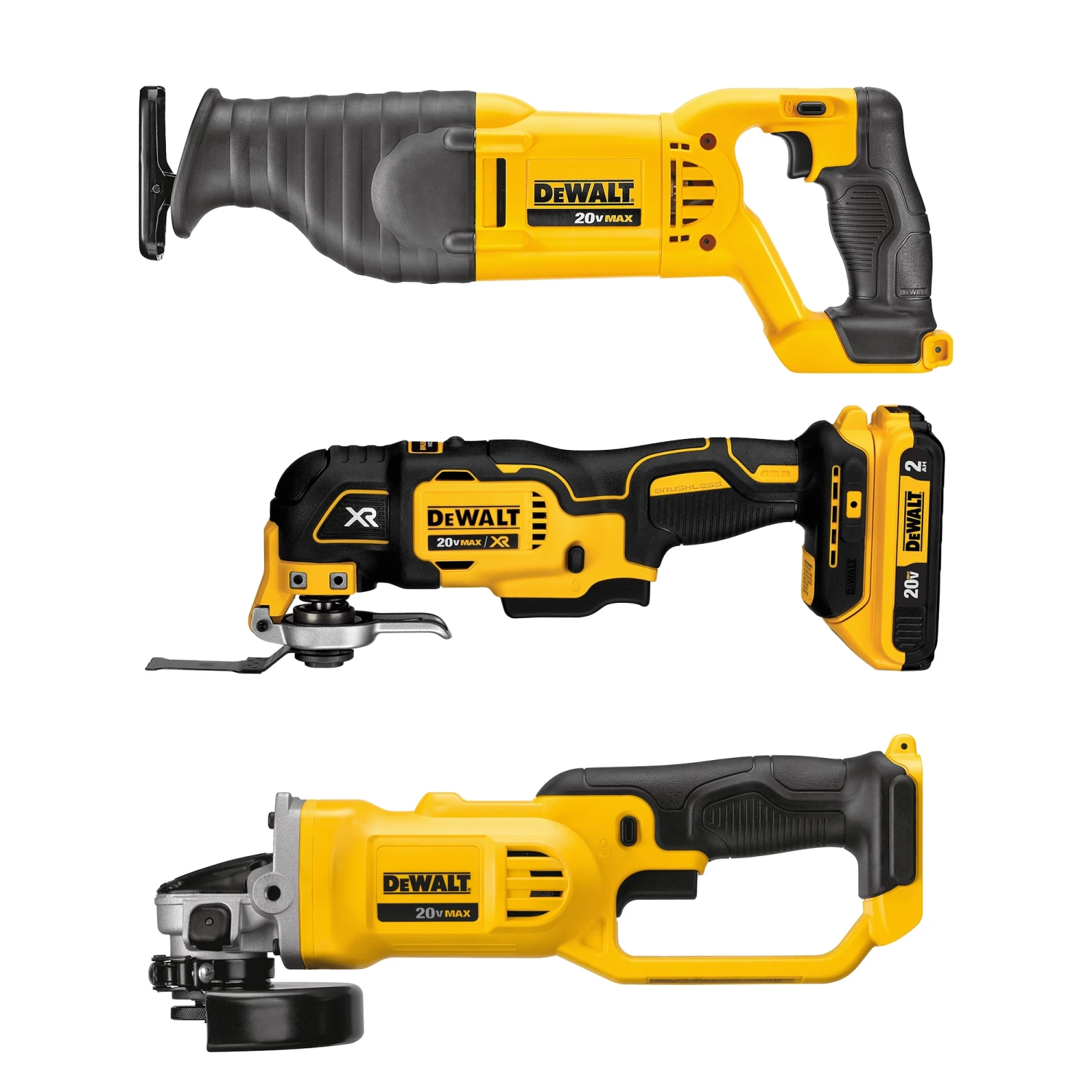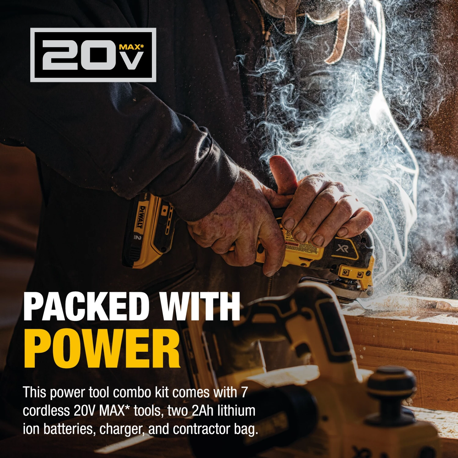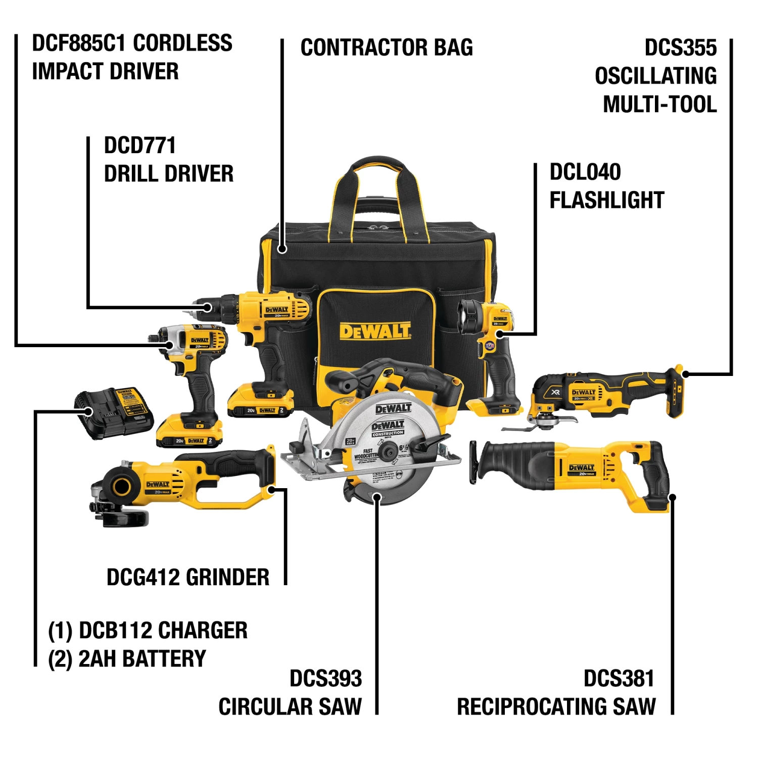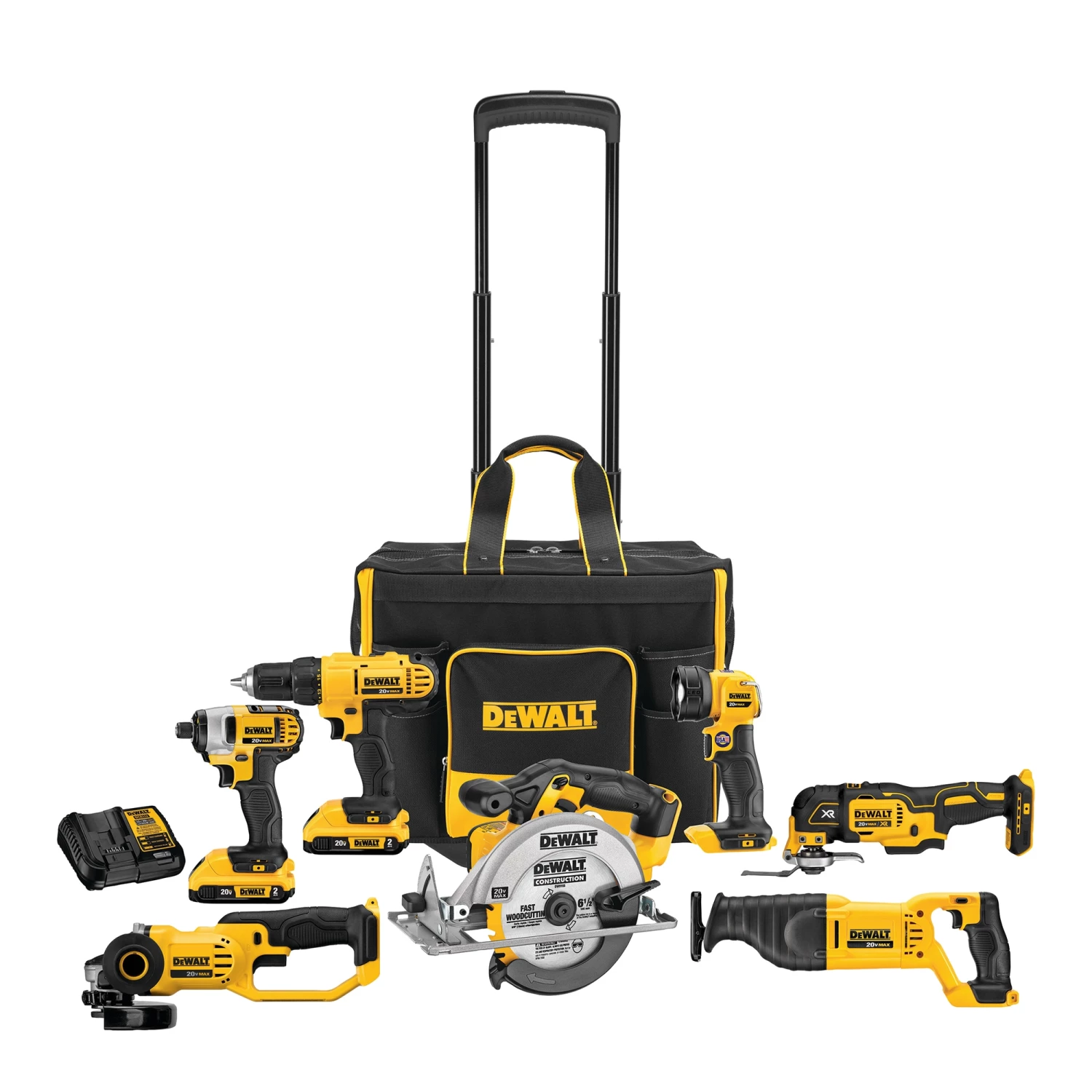 This DEWALT power tool combokit comes with seven cordless 20VMAX tools, two 2Ah lithium ion batteries, a charger, and large rolling contractor bag. DEWALT Combo Kitincludes: Drill/Driver 1/2-n.: compact, lightweight design, and high-performance motor; 6-1/2 in. Circular Saw: powerful 5,150 rpm motor; Reciprocating Saw: compact and lightweight and 1 in. stroke length and 3,000 spm; Work Light: bright LED output-110 Lumens, integral hook for hands-free use; Oscillating Multi-Tool: brushless motor; Grinder: features Quick-Change wheel release and extended run-time battery