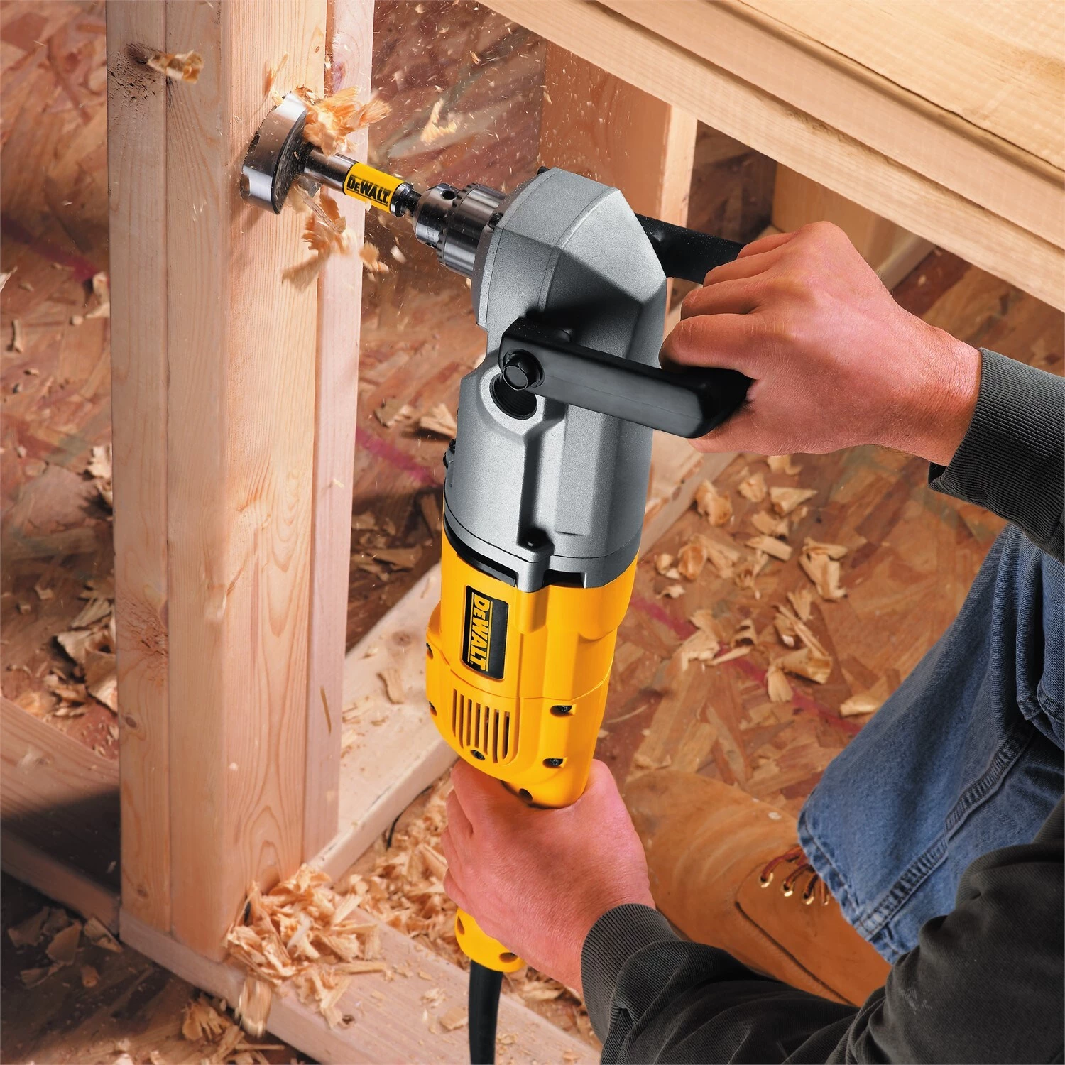 The 1/2 In. DW124 was designed for the plumber and electrician to drill larger holes safer and faster. Drill your holes up to 2-9/16 In. at 1200 rpm and your larger holes, up to 4-5/8 In., at 300 rpm the mechanical clutch in the 300 rpm setting will engage at 70 ft./lbs. Of torque, preventing kick-back. The joist and stud drill’s extra length provides more leverage, while its compact head will fit with accessories between standard studs. Includes two-position side handle, chuck key and holder, and ball handle.