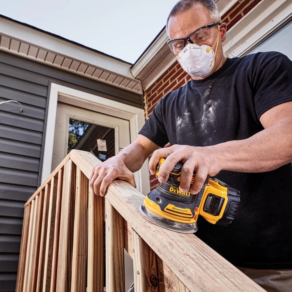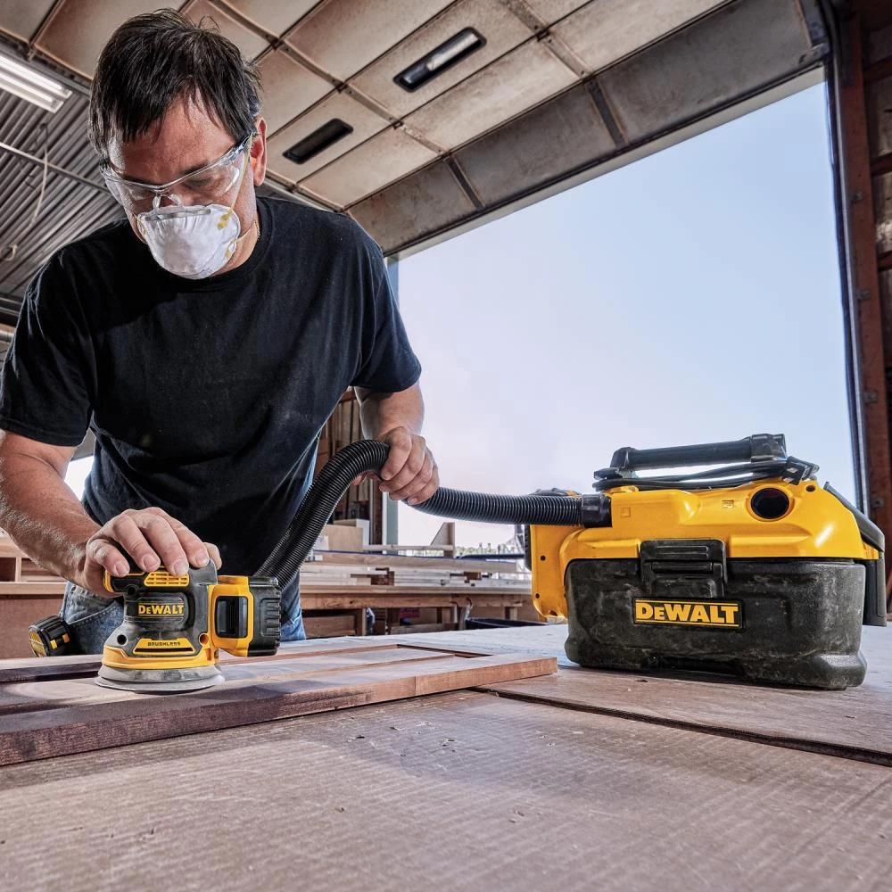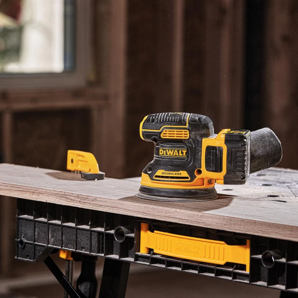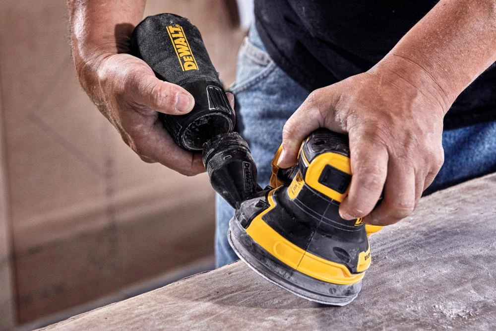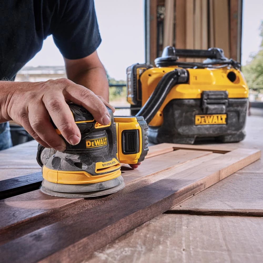 The 20V MAX XR Brushless 5-in Cordless Random Orbital Sander comes with a 5 Ah battery and provides the power and runtime needed to get the job done. A variable speed dial provides ultimate speed control from 8,000-12,000 OPM for a variety of projects. One-handed locking dust bag attaches securely to the sander to aid in dust collection or the user can attach the sander directly to the DWV010 or DWV012 dust collectors. Rubber overmold grip provides comfortable sanding. Replacement 8-hole hook-and-loop sanding pad for quick, easy paper changing.
