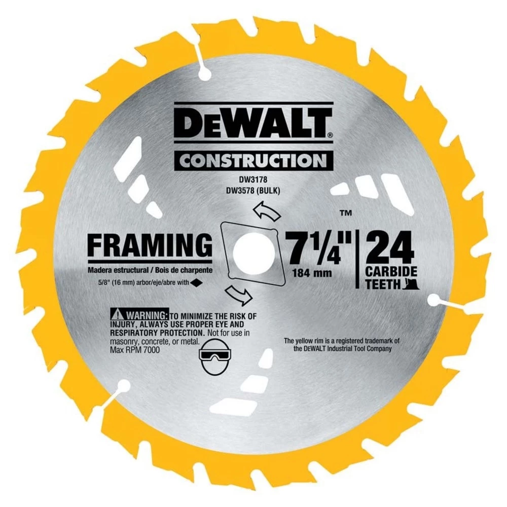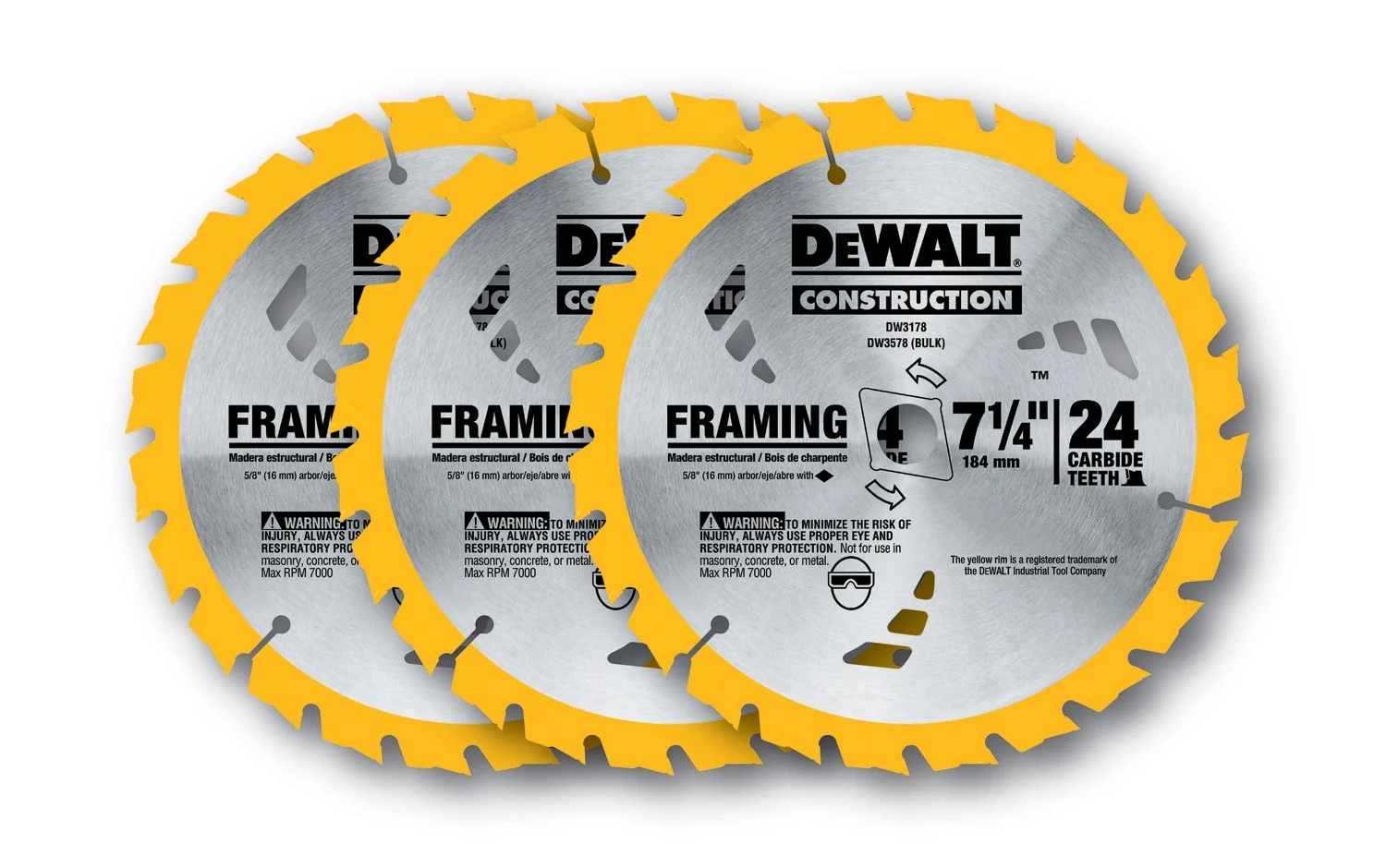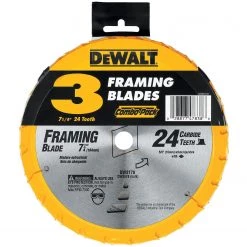 Get 3 high quality blades in one purchase with the DEWALT Construction 3-pack 7-1/4-in 24-tooth tungsten carbide-tipped steel circular saw blade. Compatible with your handheld circular saw, this framing blade features tungsten carbide-tipped teeth, making them highly durable. The teeth also have a thin kerf design, which allows you to make faster cuts. These design elements of the blade help see you through multiple cutting projects in little to no time. The plate of the blade has ribbed heat vents, allowing it to keep the temperature level and reducing blade flexing or binding. The blade is also coated with anti-stick coating, preventing pitch and resin buildup, minimizing gum-up, and reducing friction. Get your 3-pack 7-1/4-in 24T blades for circular saws at Lowes.com today.