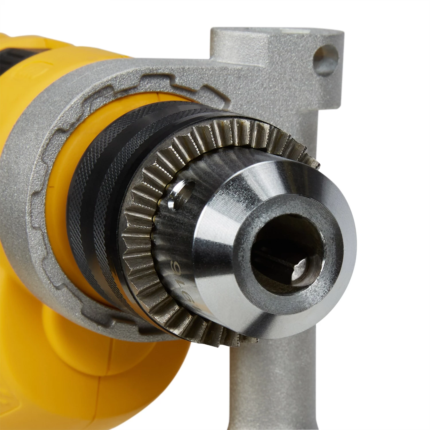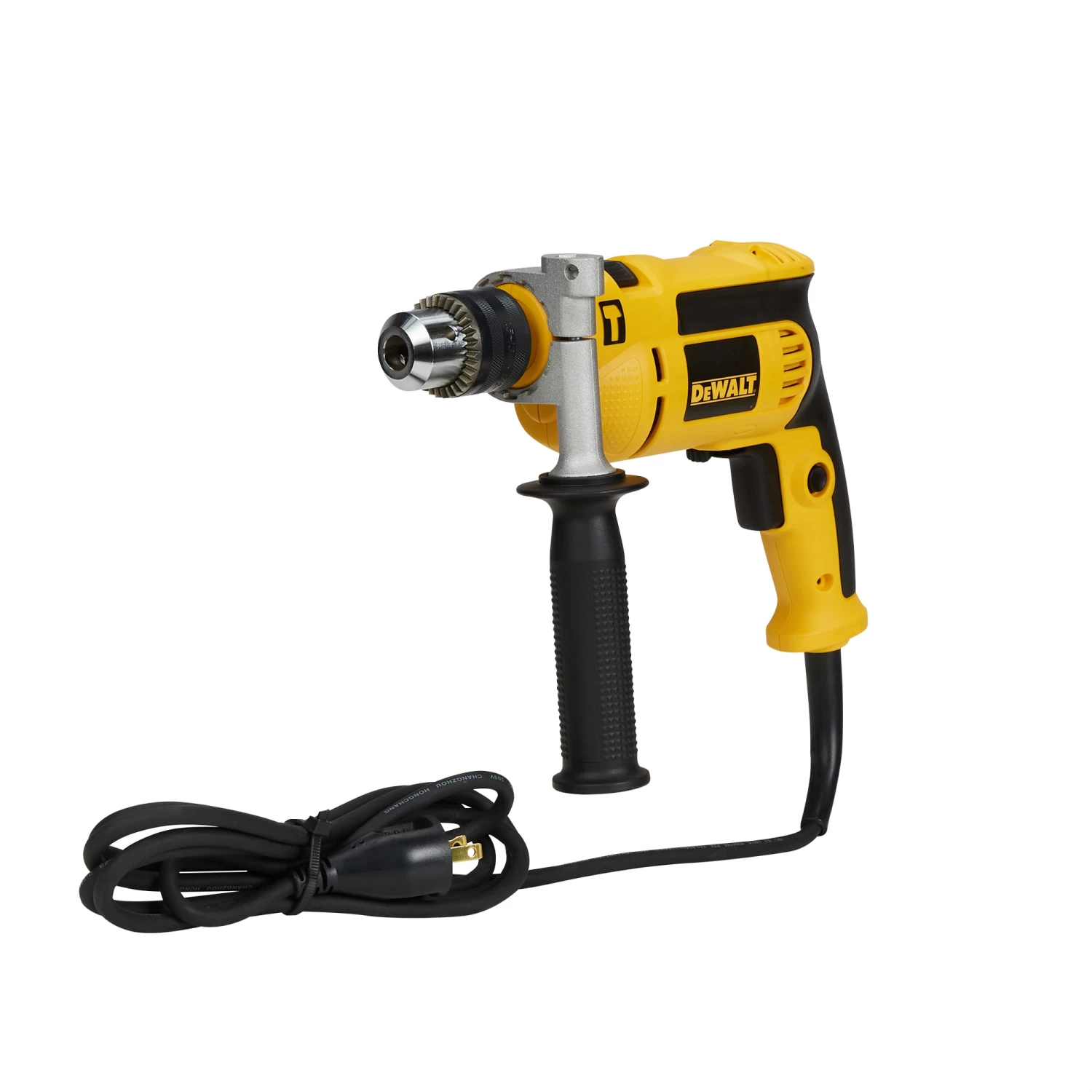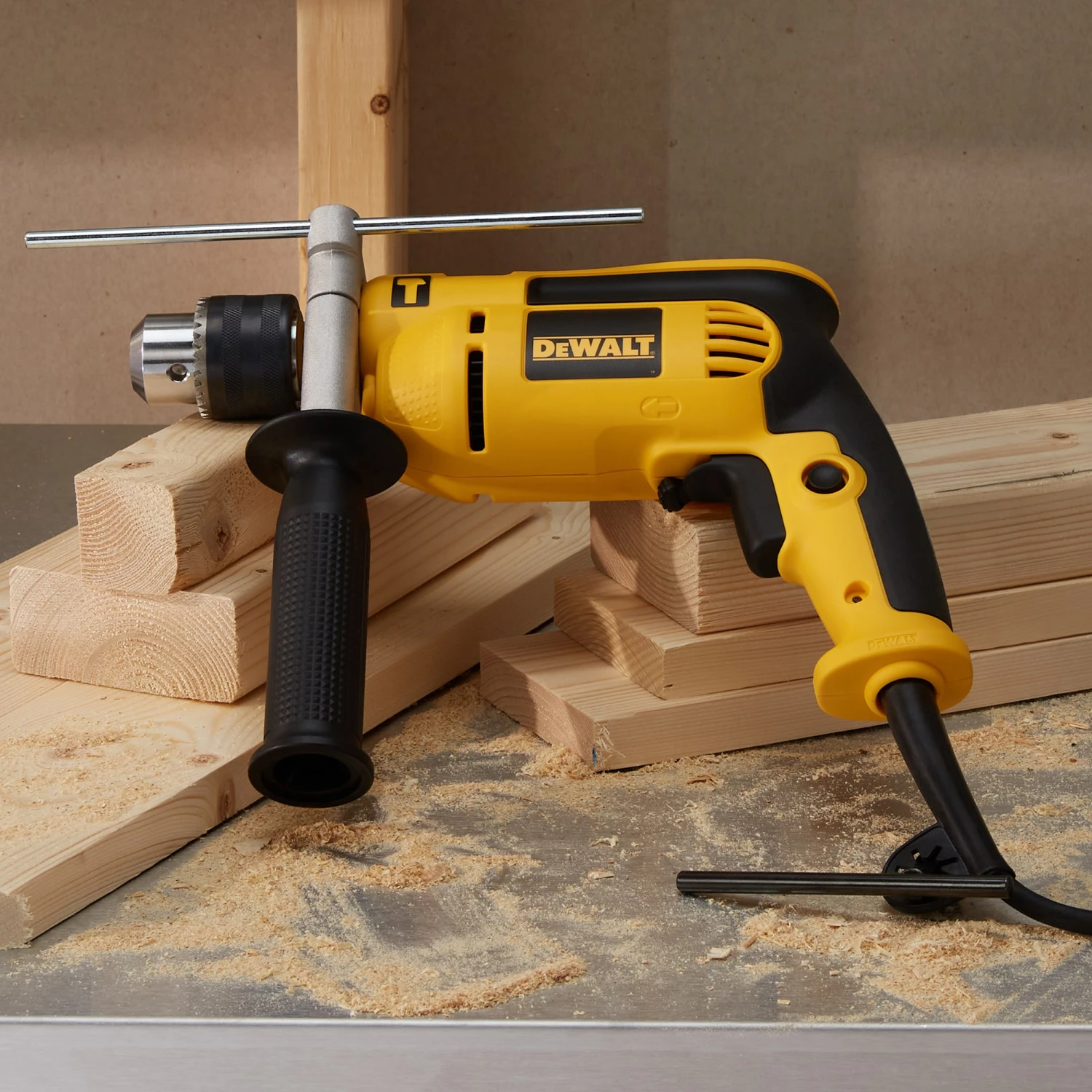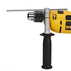 DEWALT 1/2 In. single speed hammer drill. 360รย side handle with depth rod offers greater control, versatility, and increased depth accuracy. Variable speed allows for precise hole placement on work surface. Compact design (10.3 In. length) allows for comfortable use and easy access to tight spaces. Lock-on trigger gives the option to keep the drill running continuously when doing repetitive applications.