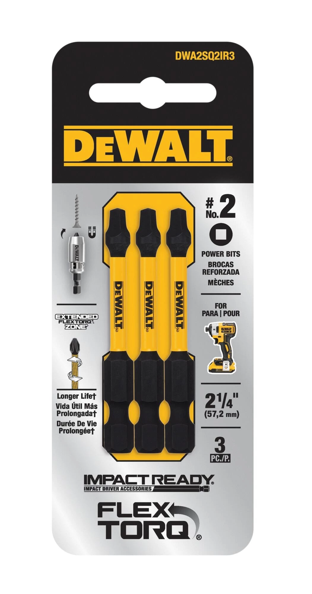 DEWALT® IMPACT READY® accessories deliver exceptional performance for extreme torque applications. FlexTorq® bits feature an Extended FlexTorq® Zone to transfer optimal torque in hard joint applications, providing durability and longer life. The bit tip is CNC machined for a precise fit, reducing cam-out under torque.