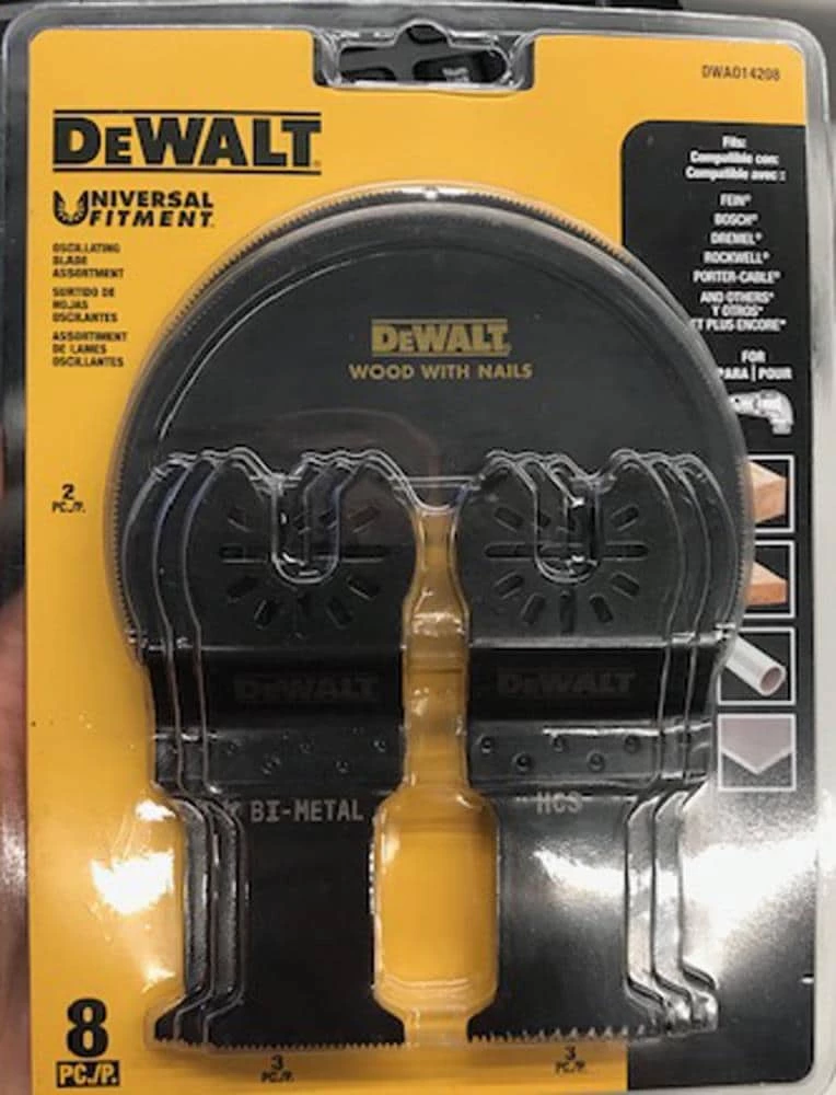 The DEWALT DWAO14208 oscillating 8-piece assortment is designed with universal fitments for use on all major brands of oscillating tools (no adapter required). This is a variety set of blades for multiple applications. Includes the DWA4203, DWA4206, and DA4210.