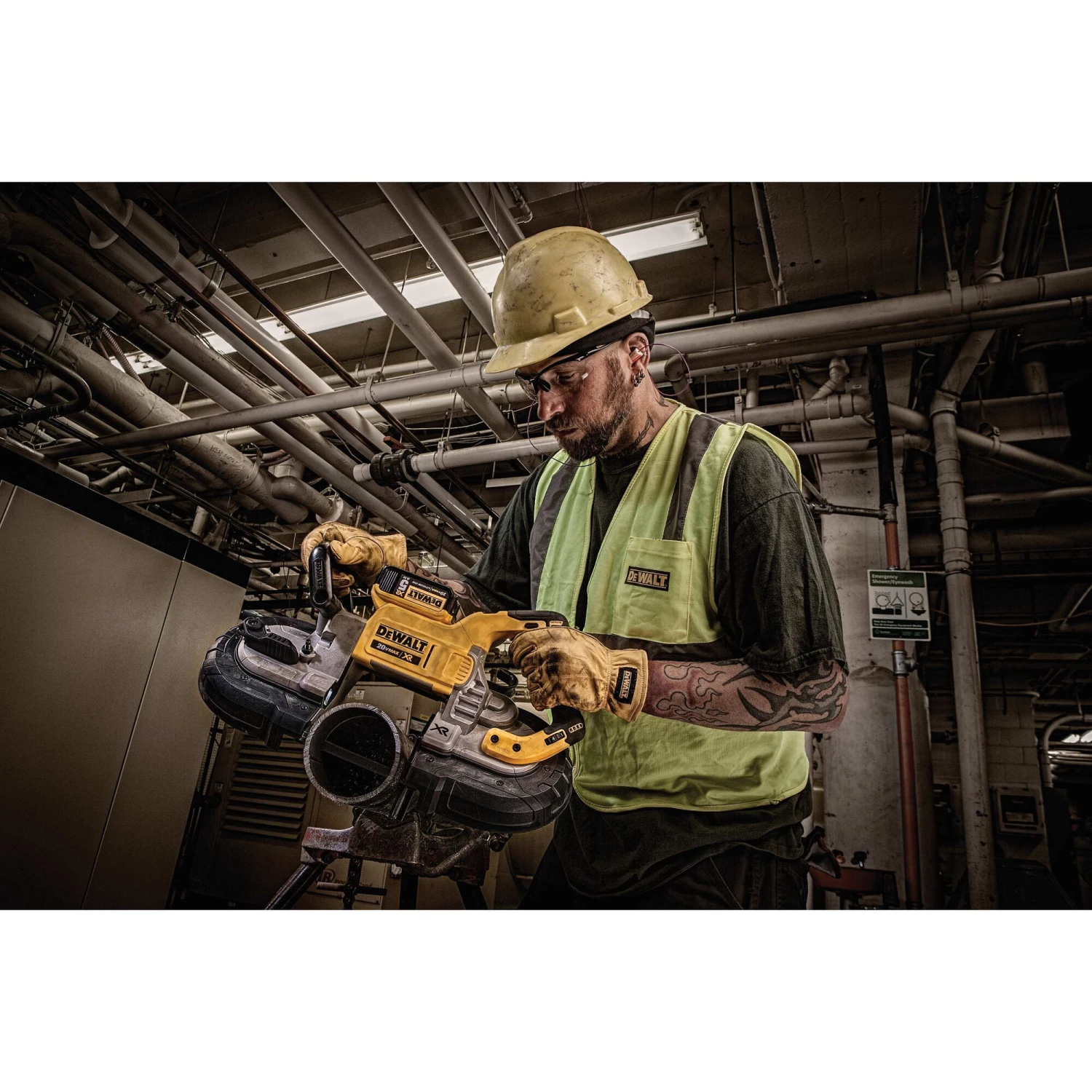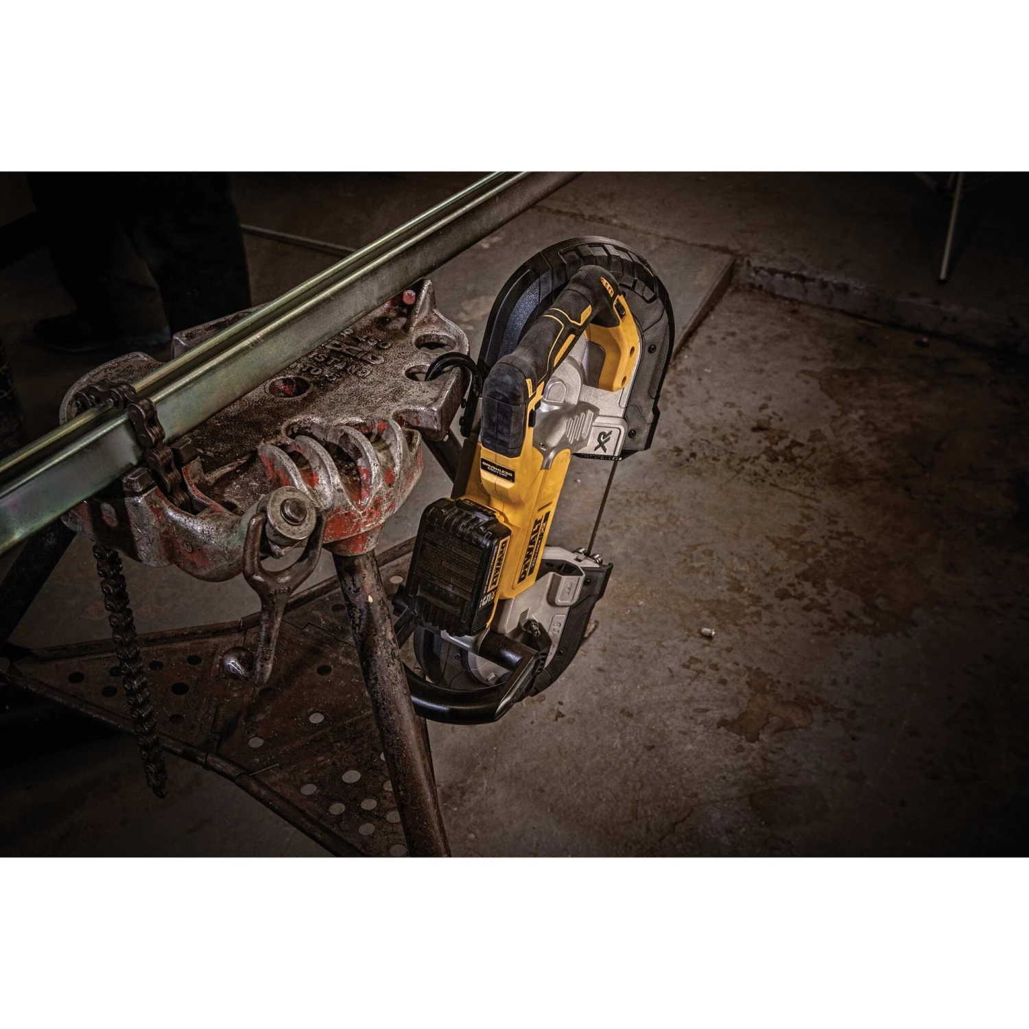 The DEWALT DCS374B 20V MAX XR deep cut band saw features a 5-in cut capacity to cut strut, pipe, angle iron, pipe and various other materials. Cuts up to 4-in SCH 40-pipe and double strut. This band saw has an LED work light with a 20-second delay that illuminates dark work surfaces for accurate cutting, and offers variable speed trigger and dial allow for versatility and control. The DEWALT deep cut band saw is capable of up to 149-cuts of 1-5/8-in strut with 14-TPI blade. There is an integrated hang hook which allows user to hang the saw without damaging the front handle or base, and the tool-less blade changing lever loosens blade tension for easy blade changes. This is a bare tool item – battery sold separately.