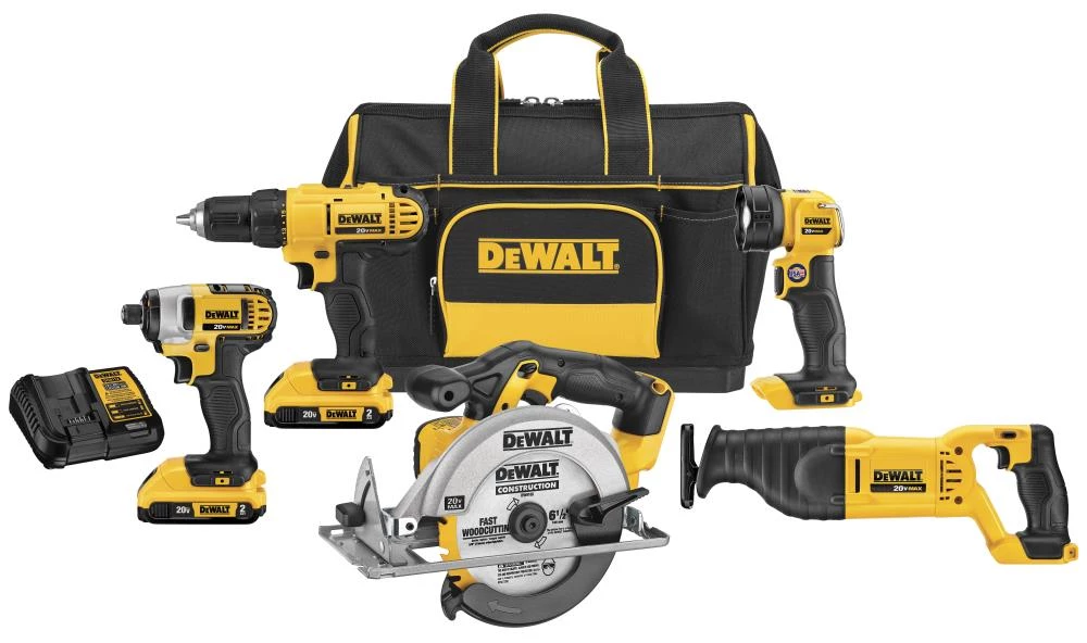 This power tool combo kit comes with five cordless 20V MAX tools, two 2.0-Ah lithium ion batteries, charger, and medium premium contractor bag. The five tools include one 1/2-in cordless drill/driver, 1/4-in cordless impact driver, 6-1/2-in cordless circular saw, cordless work light and cordless reciprocating saw.