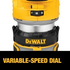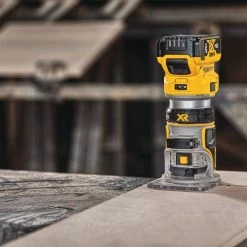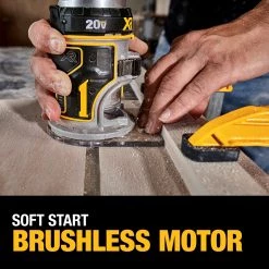 The 20V MAX XR cordless compact router provides power like a corded compact router while providing the convenience of a cordless tool. The plastic fixed base and dual LED lights help to illuminate the work surface and provide superior bit visibility. This cordless router is equipped with variable speed control for optimal bit speed in each application. The release clamp allows for quick and easy bit and base change.