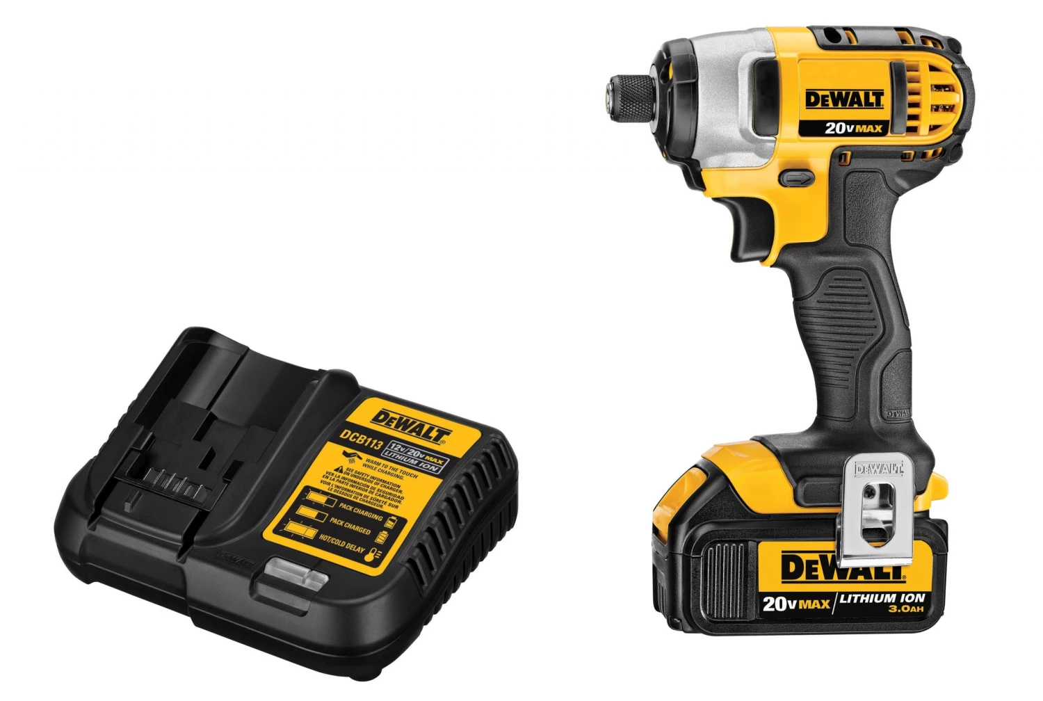 - Includes DCF885 20-volt MAX 1/4-in impact driver, one 20-volt MAX lithium ion 3.0 Ah battery, a charger, a belt hook and a kit box
