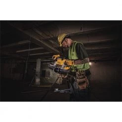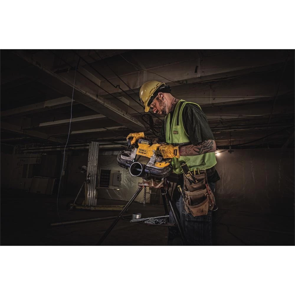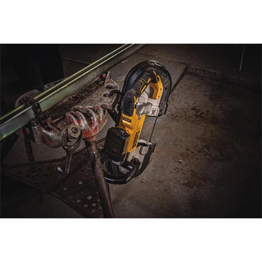 The DEWALT DCS374P2 20 V max XR deep cut band saw kit features a 5-in x 4-3/4-in cut capacity to cut strut, pipe, angle iron, pipe and various other materials. Cuts up to 4-in SCH 40 pipe and double strut. This band saw has an LED work light with a 20 second delay that illuminates dark work surfaces for accurate cutting, and offers variable speed trigger and dial allow for versatility and control. The DEWALT deep cut band saw is capable of up to 149 cuts of 1-5/8-in strut with 14 TPI blade. There is an integrated hang hook which allows user to hang the saw without damaging the front handle or base, and the tool-less blade changing lever loosens blade tension for easy blade changes. Includes: (1) DCS374 20 V max band saw, (2) DCB205 20 V max 5.0 Ah batteries, (1) charger, (1) kit box, (1) 18TPI band saw blade.