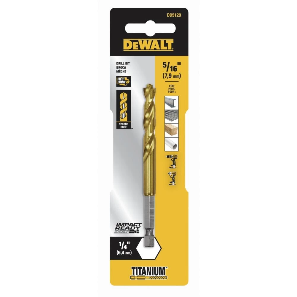 Constructed from one solid piece of heavy-duty metal, DEWALT Impact Ready titanium drill bits are up to 5 times more durable than 2-piece conventional bits. A patented web taper helps to increase bit strength, and a patented pilot point tip delivers speed and clear, burr-free holes with helps to reduced bit walking. Ideal for metal, wood, and plastic.