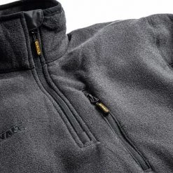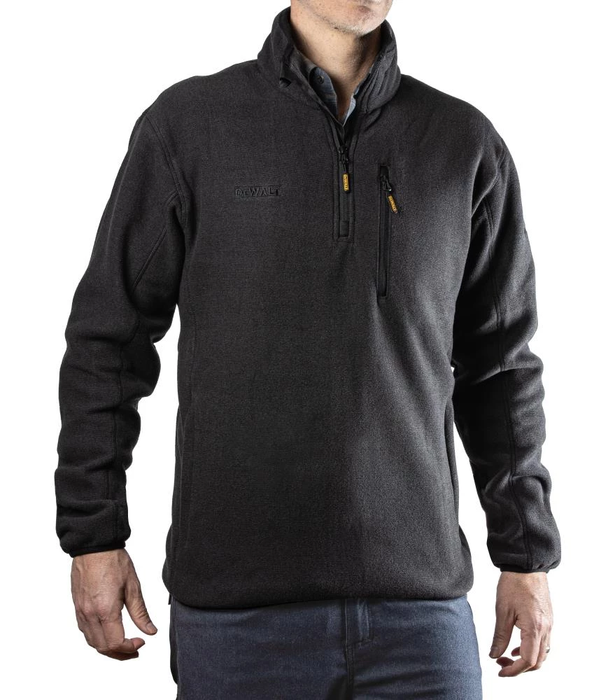 Whether you are in the office, meeting with a client or heading out to the job site, grab your DEWALT Quarter Zip fleece pullover for more of that professional look. The 1/4 zip pullover will keep you warm on those chilly days or can be used as an inner layer on the really cold ones. The DEWALT 1/4 zip pullover is made of 100% polyester fleece that is very soft to the touch. It has a slight heather effect on the outside with a solid color brushed fleece on the inside. This fabric is lighter weight, moisture absorbing and quicker drying than the usual heavier fleece. The elastic bound waist and sleeves give a snug fit to keep the warm air in and the cold air out. The quarter zip design has a storm flap for added warmth. For a little extra buffer, zip it all the way up and use the funnel neck for additional protection from the elements. The sleeves are specially shaped for ease of movement. DEWALT added 3 zip closure pockets, 2 lower reach-in pockets and 1 multipurpose on the left chest. You will be proud to wear this pullover with the embroidered DEWALT logo on the right chest and the “Guaranteed Tough” logo on the left sleeve.?acked by DEWALT’s 100% guarantee against defects in materials and workmanship, DEWALT apparel is guaranteed to offer a level of fit, durability and comfort you would expect from work wear featuring the DEWALT name. You too will be “Guaranteed Tough” in your DEWALT Quarter Zip fleece.