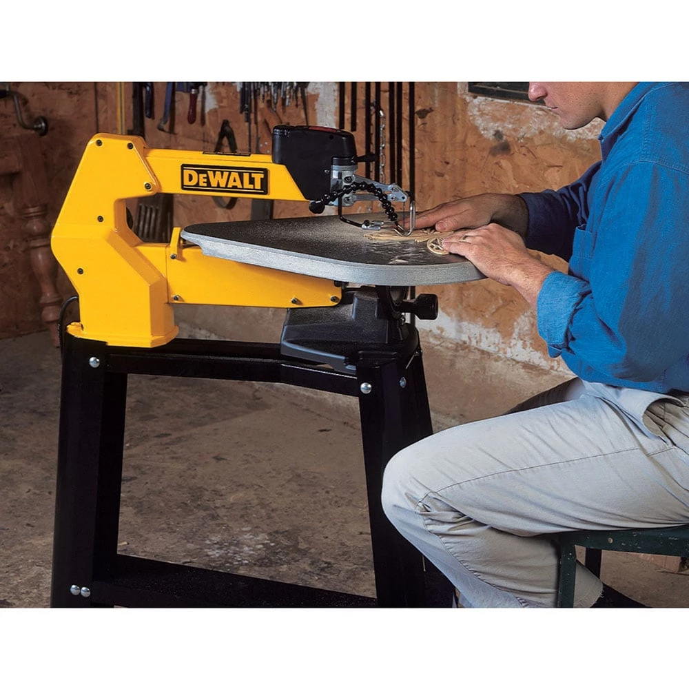 The DW788 20-in variable-speed scroll saw operates quietly and smoothly for accuracy. The tool-free blade clamp allows for quick and easy blade changes. Convenient placement on the lift able arm of the dust blower, power switch, and saw adjustments on the front of the upper arm provide for easy adjustment. Oversized, cast-iron table provides excellent material support and has the ability to bevel to both the left and right.