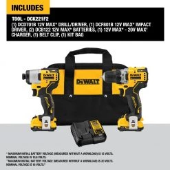 The DCK221F2 12V MAX lithium ion Brushless drill and impact driver kit is compact and performance packed. The DCD701 drill is designed for precision applications and great for applications like small pilot holes, but also can handle up to a 1/2-in spade bit. Small enough to fit in the tightest places at only 5.97-in long and enough power to get the job done with 250 UWO and a 2 speed transmission. The DCF801 impact driver is designed for precision applications and great for applications like small fasteners, but also can handle up to a 1/4-in lag bolt. Small enough to fit in the tightest places at only 5.05-in long and enough power to get the job done with 1,450 in-lbs of torque and 3 LEDs positioned on the nosecone to illuminate all work areas.