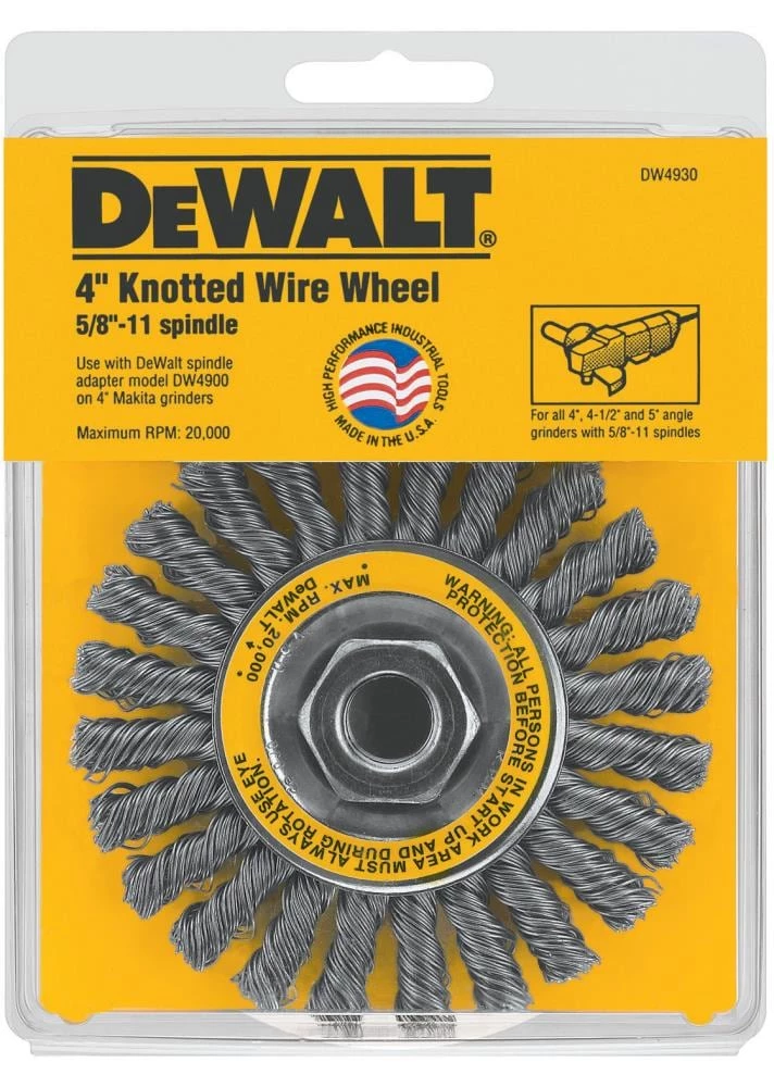 DEWALT wire wheel features highly specified wire grades, constructed with internal holding plate to ensure consistency and safety. DW4930 has 0.020 maximum wire gauge, a 5/8 – 11 arbor, and can be used at speeds up to 20,000 RPM. Wire is 100% inspected to meet demanding quality specifications. Applications include metal deburring, weld cleaning, surface preparation, edge blending, and rust removal.