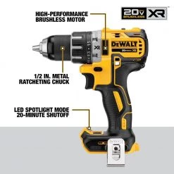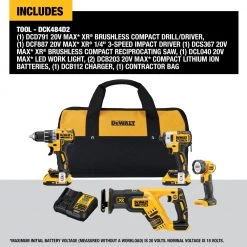 The DCK484D2 20-volt MAX XR brushless 4-tool compact Combo kit features our DCD791 compact drill/driver with two-speed transmission and LED lights for working in dark spaces. The DCF887 20-volt MAX XR brushless 1/4-in 3-speed impact driver is compact for fitting in tight spaces. Three LED lights make it ideal for working in the dark. The DCS367B 20-volt MAX XR brushless compact reciprocating saw, features a compact and lightweight design to make your jobs easier. The DCL040 is a bright flashlight to illuminate your work area with LED output of 110 lm.