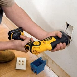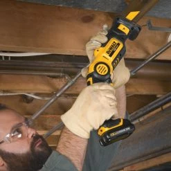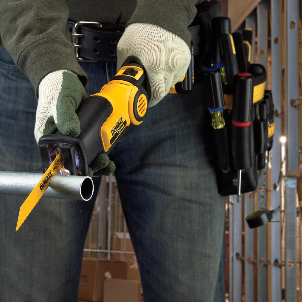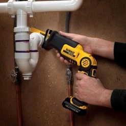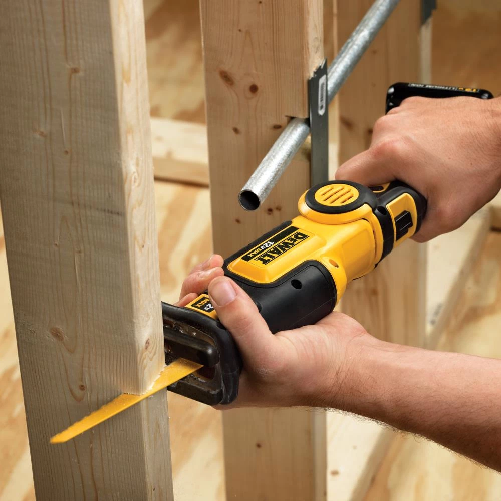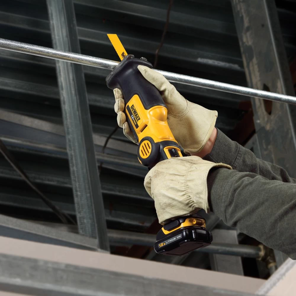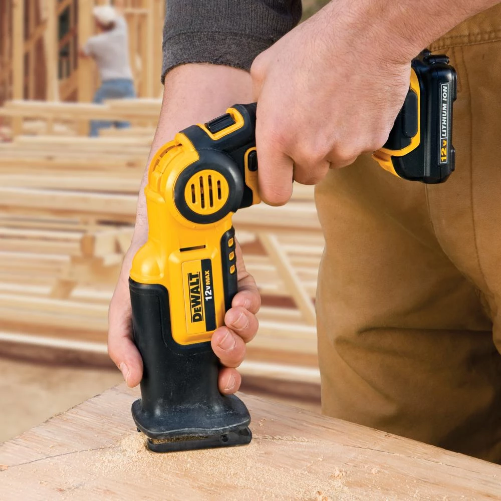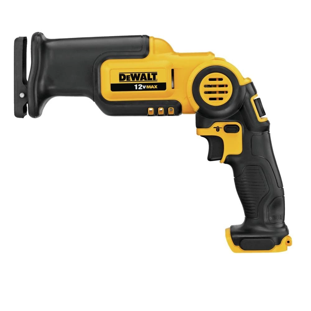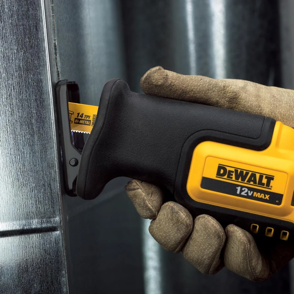 The DEWALT DCS310B 12-volt max pivot reciprocating saw bare tool is ideal for a variety of professionals including remodeler. This saw features an adjustable 3-position pivoting handle that allows user to make difficult cuts in confined spaces. It offers a 9/16-in stroke length that delivers fast cutting speed, along with a variable speed trigger with 0-2700 spm which provides blade control for precision cuts. A keyless lever-action blade clamp for quick and easy blade changes and a pivoting shoe that provides versatility while cutting. A bright LED light illuminates dark work areas for better visibility and the blade reverses for greater access to tight spaces and flush cutting. This is a bare tool item, battery sold separately.