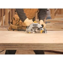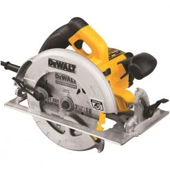 DEWALT 7-1/4 In. lightweight circular saw with electric brake. Depth of cut capacity of 2-9/16 In. ball bearing lower guard provides long life in environments. Durable high grade aluminum smooth base for accurate cuts. Lower guard design improves performance when making bevel cuts and cutting shims. An integrated dust blower allows the user to clear its line of sight while cutting. Patented tough cord protection system, provides 3x durability against cord pull-out.
