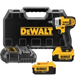 The 20-volt MAX lithium ion 3/8-in impact wrench kit features a compact, lightweight design that fits into all kinds of tight areas. It has 3 LED lights with 20 second delay after trigger release, that helps to provide visibility without shadows. Also features a hog ring anvil to easily change sockets. A 1/2-in square drive. The textured anti-slip comfort grip provides maximum comfort and control for the user. Powered by a XR Li-ion battery with fuel gauge which provides 33% more capacity over standard packs. Applications include driving and removing fasteners in wood, metal or concrete/fastening and removing nuts and bolts/and primarily for use with impact sockets. Includes fast charger, two 20-volt MAX XR premium Li-ion batteries (4.0 Ah) and kit box. Maximum initial battery voltage – measured without a workload – is 20-volt nominal voltage is 18.