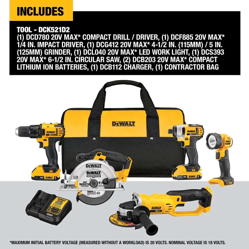 The 20V MAX compact 5-tool combo kit (2 Ah) features our DCD780 20V MAX lithium ion compact drill/driver which is lightweight and compact for doing a wide variety of jobs where space is tight. The DCF885 20V MAX lithium ion 1/4-in impact driver takes hard-hitting power to hard-to-reach fasteners. The DCS393 20V MAX circular saw with 6-1/2-in carbide blade helps you work efficiently by cutting 2×4 boards at a 45-degree angle in a single pass. The DCG412 20V MAX XR lithium ion 4-1/2-in/5-ft grinder increases productivity with features like quick-change wheel release, convenient trigger switch with lock-off button, and optimized efficiency for extreme runtime to handle high-demand duty. The DCL040 is a bright flashlight to illuminate your work area with LED output of 110 lumens.
