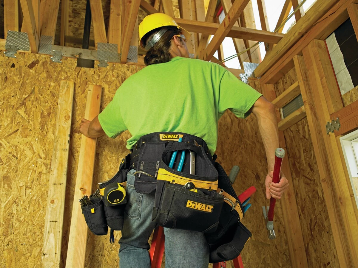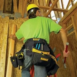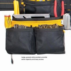 The DEWALT 31 pocket professional carpenter’s combo tool apron is built for comfort while optimizing tool carrying capacity. This tool apron is constructed of durable heavy-duty polyester fabric and include a 6″ wide padded tool belt with double-tongue steel roller buckle that keeps the belt stable and comfortable throughout the day.