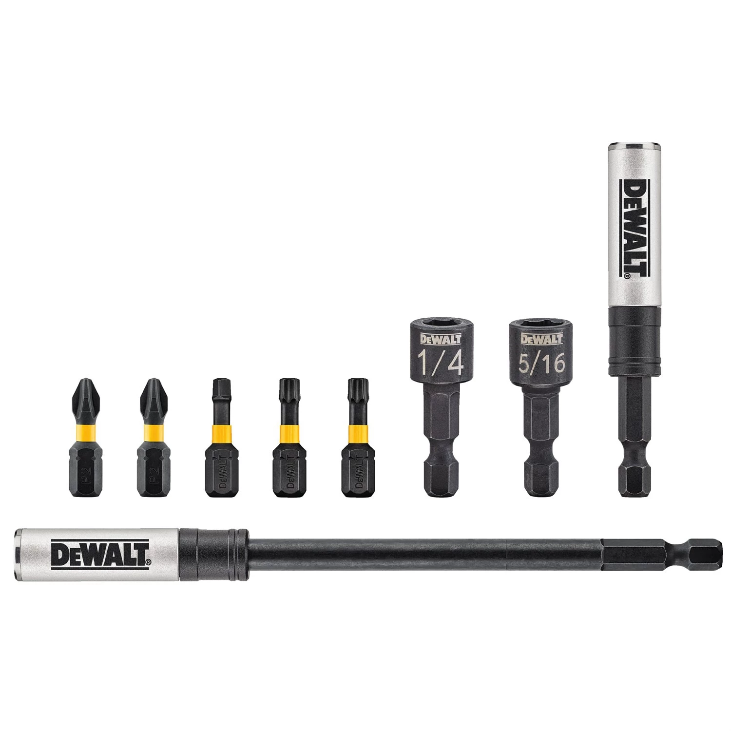 The DEWALT 9-piece impact driver bit kit is easy to use, durable, and precise, making it an essential bit set for all your fastening needs. It features FlexTorq bits that are designed to bend slightly during use to avoid breakage. They also improve torque, which makes fastening simple and quick. This impact driver bit set also has locking bit holders and strong magnetism. Each bit is also CNC-machined to fit perfectly into screw recesses. These features minimize wobbling and slippage during use, giving you a stable and safe experience while fastening screws and nuts for your professional and do-it-yourself projects. This kit also features a quick-change mechanism, making it a breeze to switch bits. Shop this workshop must-have at Lowes.com today.